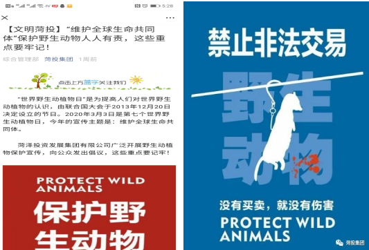 3月3日是第七個世界野生動植物日,今年的宣傳主題是:維護全球生命共同體。菏澤投資發(fā)展集團有限公司廣泛開展野生動植物保護宣傳,并通過公司微信公眾號向廣大市民發(fā)出“保護野生動植物,維護生態(tài)平衡,拒食野生動物,守護綠色地球”的倡議,呼吁善待野生動物,革除濫食野生動物陋習,建設人與野生動植物和諧共生的美好家園,維護全球生命共同體。