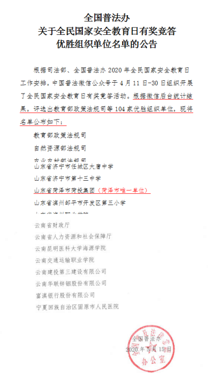 5月19日,全國普法辦公布了全民國家安全教育日有獎(jiǎng)競答活動(dòng)優(yōu)勝組織單位名單,教育部政策法規(guī)司等104家單位被評(píng)為優(yōu)勝組織單位,菏投集團(tuán)名列其中,為菏澤市唯一優(yōu)勝組織單位。