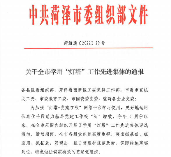 菏澤投資集團2家黨組織榮獲“全市學用‘燈塔’工作先進集體”稱號