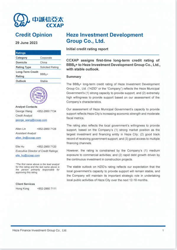 立志逐朝日,云開萬象明。經(jīng)過為期近一年的周密籌備,自5月起,菏澤投資集團(tuán)主體信用評(píng)級(jí)工作取得重大突破,兩個(gè)月內(nèi),集團(tuán)先后獲大公國際AA+主體信用認(rèn)定、中證鵬元AA+主體信用認(rèn)定、中誠信亞太BBBg+境外主體信用認(rèn)定,3家機(jī)構(gòu)評(píng)級(jí)展望均為穩(wěn)定。其中,集團(tuán)獲BBBg+境外主體信用評(píng)級(jí)為全市首家,是我市現(xiàn)有國際信用等級(jí)最高的市屬國企。