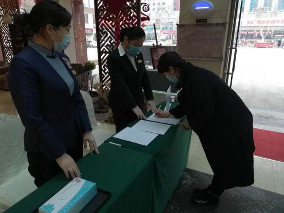 總臺(tái)設(shè)置一米間距隔離欄和提示牌;配備免洗手液、消毒濕巾、抽紙、口罩供客人免費(fèi)使用;總臺(tái)接待員工帶醫(yī)用一次性口罩、手套防護(hù),并配備有客用手消毒液、抑菌手紙。
