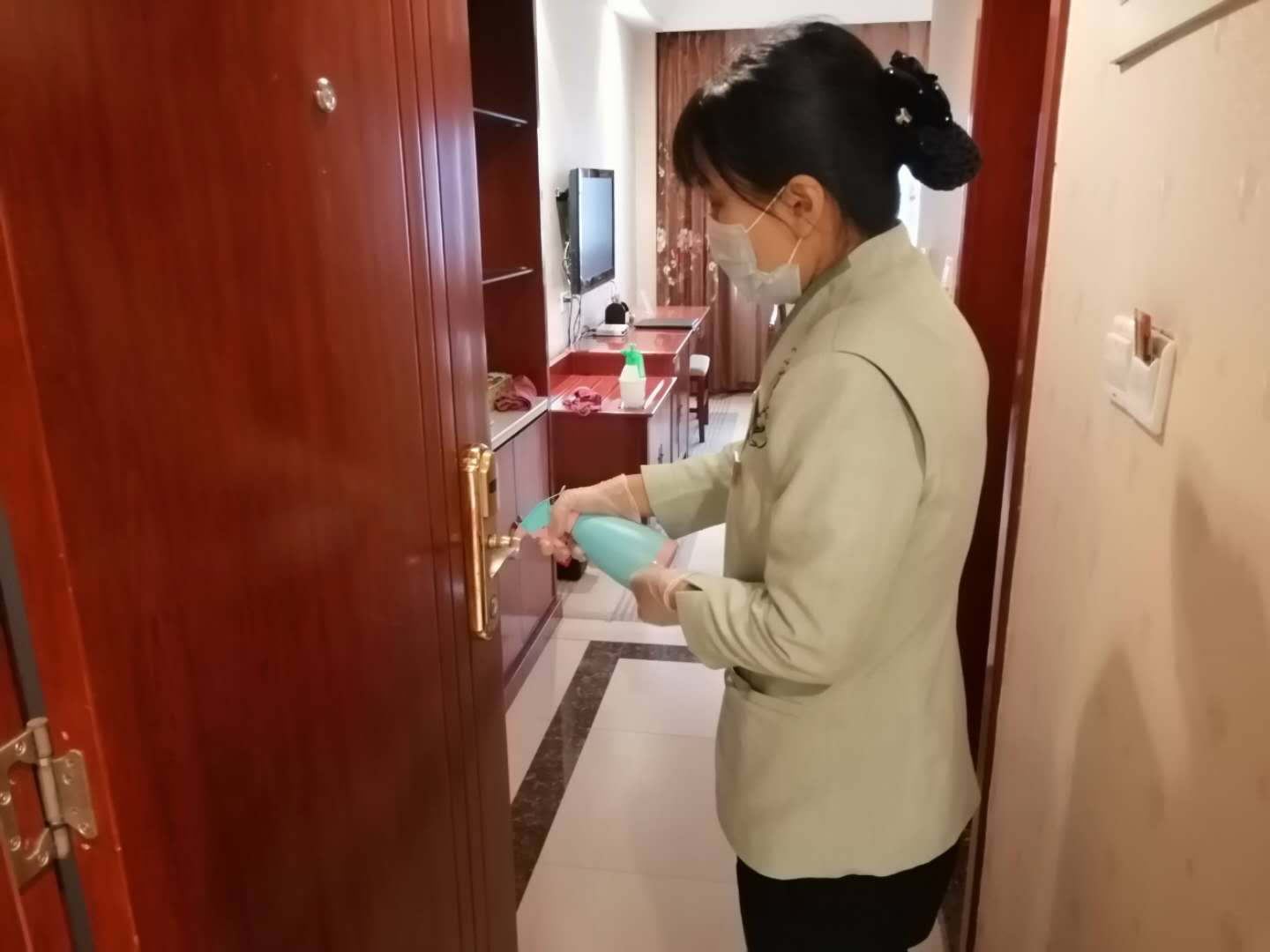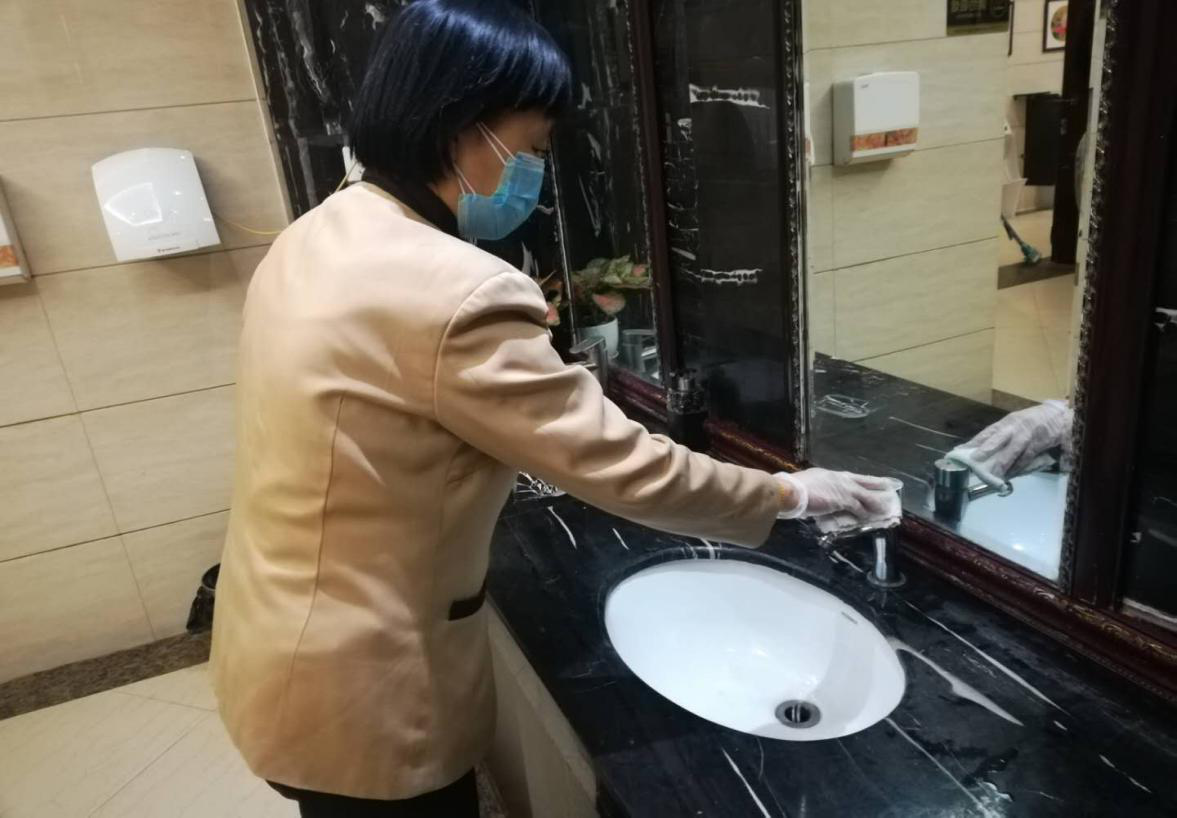 每日安排專人對(duì)大堂、樓道、地面、衛(wèi)生間等公共區(qū)域定期消毒。總臺(tái)對(duì)于客用物品一客一用一消毒。