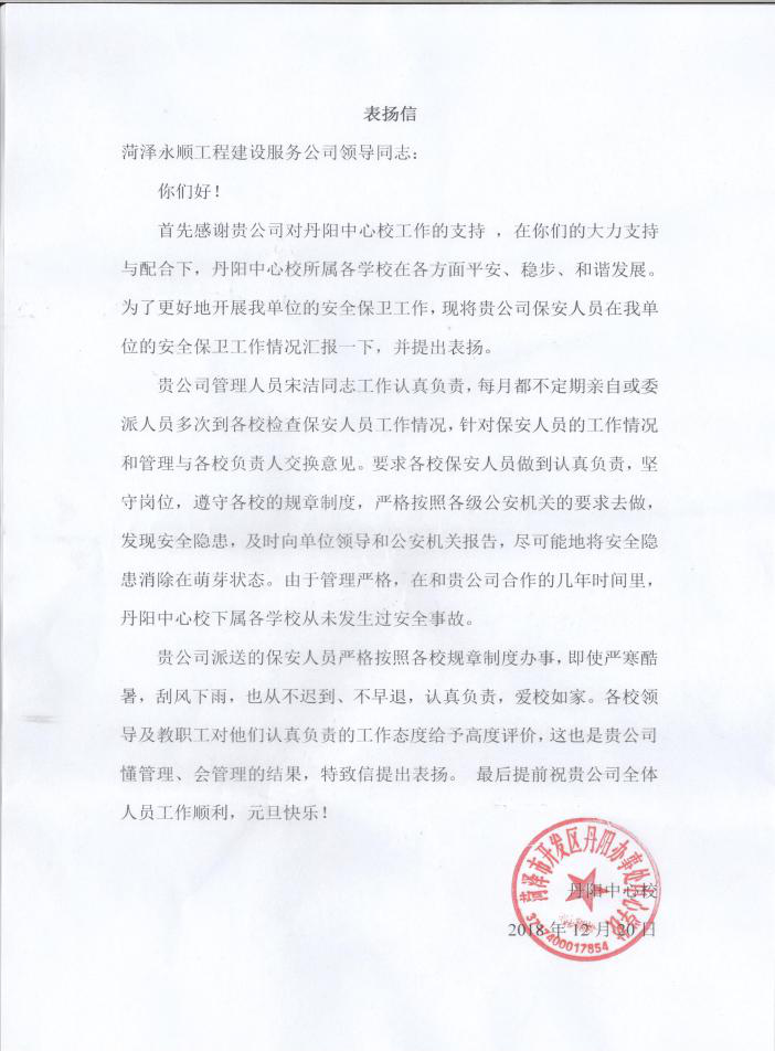 12月26日,永順工程公司物業(yè)部收到丹陽中心校的表揚(yáng)信,對(duì)物業(yè)部熱情周到、愛校如家的服務(wù)表示認(rèn)同和感謝。