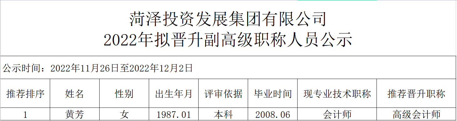 菏澤投資發(fā)展集團(tuán)有限公司2022年擬晉升副高級職稱人員公示