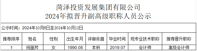 菏澤投資發(fā)展集團有限公司2024年擬晉升副高級職稱人員公示